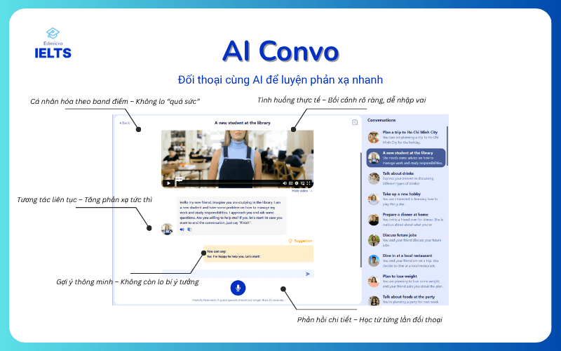Một trong những thử thách lớn nhất khi học Speaking là khả năng phản xạ – làm sao có thể trả lời trôi chảy, mạch lạc mà không cần mất thời gian nghĩ quá lâu. Tính năng AI Convo trên Edmicro chính là công cụ giúp bạn luyện phản xạ hiệu quả, bằng cách nhập vai và trò chuyện với AI trong nhiều tình huống thực tế.