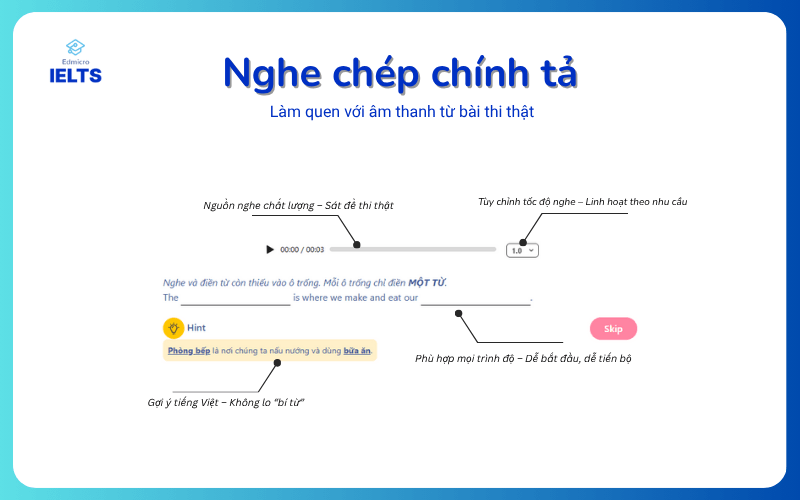 Quá trình luyện nghe tại Edmicro được xây dựng theo lộ trình rõ ràng, bắt đầu từ các câu đơn, ngắn, dễ nghe để người học mới hình thành phản xạ nghe và nhận diện từ khoá. Khi đã quen, bạn sẽ được nâng cấp lên các đoạn hội thoại dài, phức tạp giống đề thi thật.