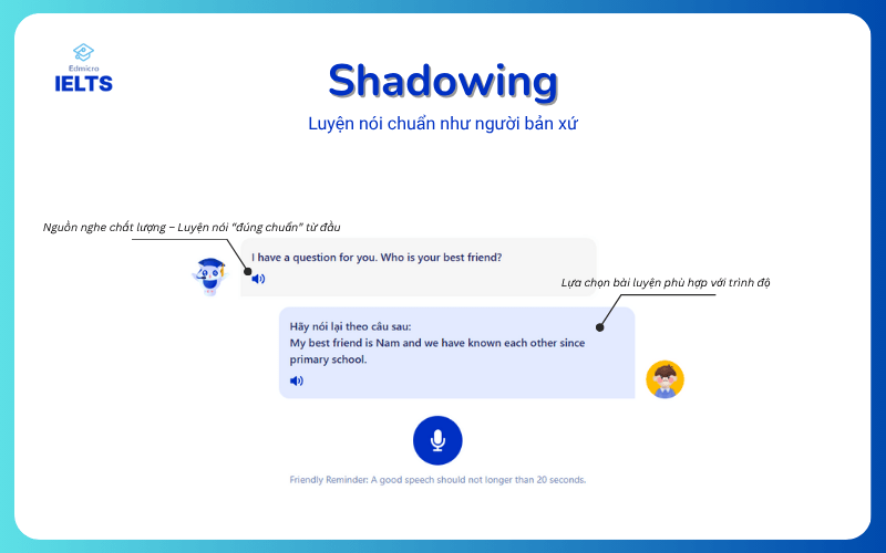 Với Edmicro, tính năng Shadowing được tối ưu để phù hợp với cả người mới bắt đầu, giúp bạn luyện tập một cách có định hướng và không bị “choáng” khi tiếp cận phương pháp này.