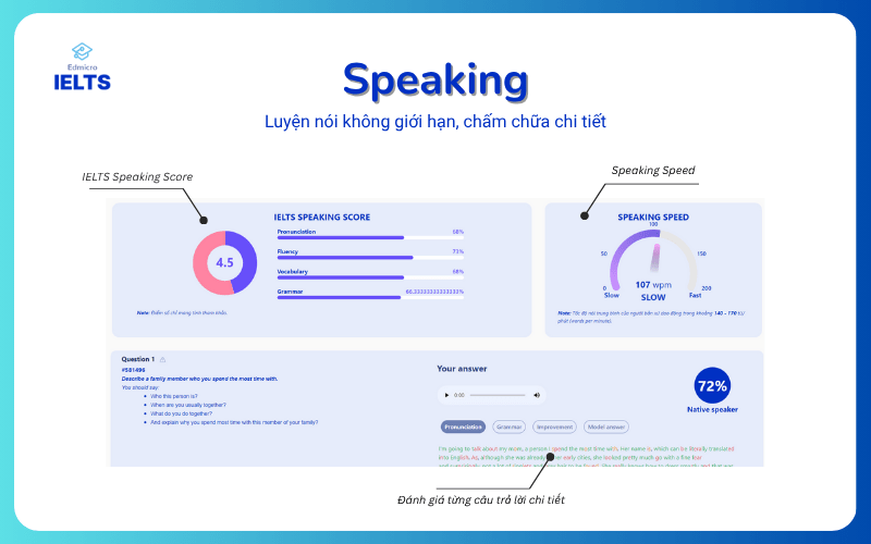 Speaking Speed: AI đo tốc độ nói và đưa ra nhận xét về độ nhanh – chậm. Nếu bạn nói quá nhanh, hệ thống sẽ nhắc nhở để tránh nuốt âm và mất điểm vì không rõ ràng.
