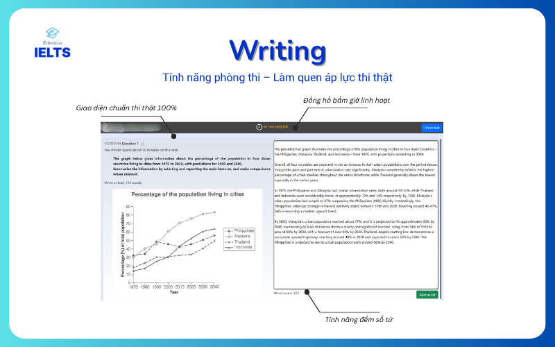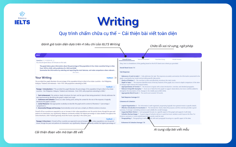 IELTS Writing không chỉ đơn thuần là đưa ra quan điểm – mà còn là kỹ năng trình bày, lập luận và sử dụng ngôn ngữ học thuật một cách mạch lạc. Với tính năng Writing AI của Edmicro, bạn sẽ được luyện tập trong giao diện mô phỏng phòng thi thật, kết hợp với công cụ hỗ trợ mạnh mẽ và hệ thống chấm chữa tự động chi tiết, giúp bạn cải thiện từng phần trong bài viết.