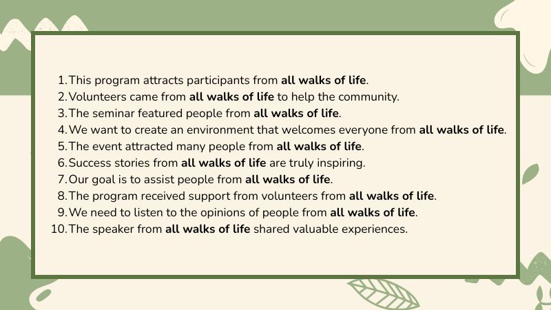 All walks of life là một thành ngữ tiếng Anh dùng để chỉ tất cả các tầng lớp xã hội, mọi loại người với những công việc, địa vị và hoàn cảnh sống khác nhau. Nó nhấn mạnh sự đa dạng của con người trong một cộng đồng hoặc xã hội.