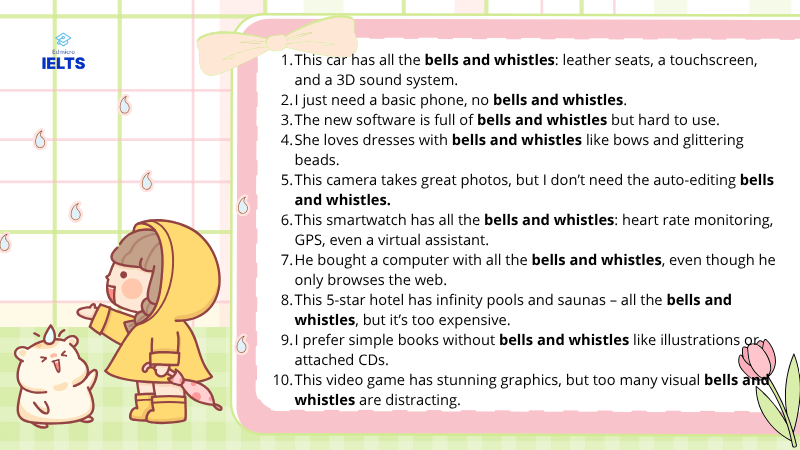 - This phone has all the bells and whistles: wireless charging, a 4K camera, and a foldable screen. ( Chiếc điện thoại này đủ thứ: sạc không dây, camera 4K, màn hình gập.) (mang nghĩa tích cực)