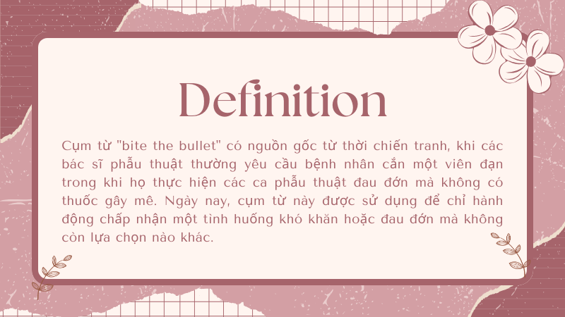 Cụm từ “bite the bullet” có nguồn gốc từ thời kỳ chiến tranh, khi các bác sĩ phẫu thuật thực hiện các ca phẫu thuật khẩn cấp mà không có thuốc gây mê. Trong những tình huống này, bệnh nhân thường phải chịu đựng cơn đau dữ dội. Để giúp giảm bớt cảm giác đau đớn, các bác sĩ thường khuyên bệnh nhân cắn một viên đạn hoặc một vật cứng khác trong khi họ tiến hành phẫu thuật. Hành động này không chỉ giúp bệnh nhân tập trung vào việc cắn mà còn tạo ra một hình ảnh mạnh mẽ về sự can đảm và quyết tâm đối mặt với nỗi đau.