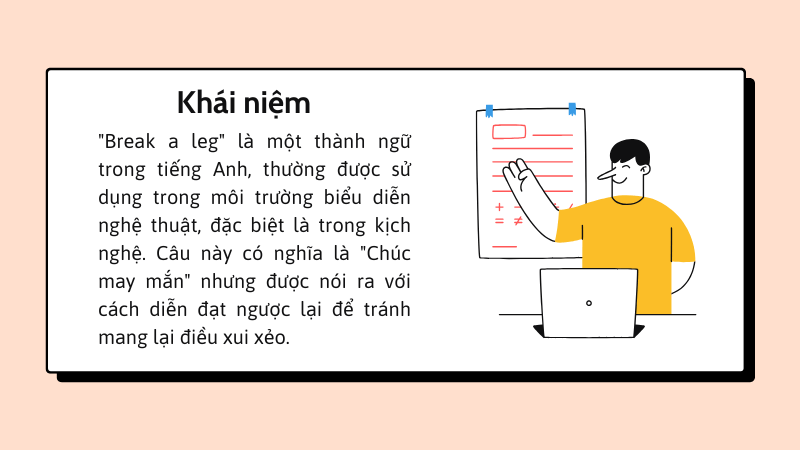 “Break a leg” là một thành ngữ trong tiếng Anh, thường được sử dụng trong môi trường biểu diễn nghệ thuật, đặc biệt là trong kịch nghệ. Câu này có nghĩa là “Chúc may mắn” nhưng được nói ra với cách diễn đạt ngược lại để tránh mang lại điều xui xẻo.
