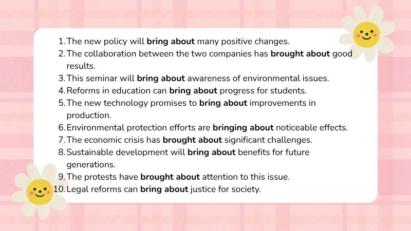 Bring about là một phrasal verb hữu ích để diễn tả quá trình một hành động hoặc sự kiện tạo ra một kết quả nào đó. Việc sử dụng thành thạo “bring about” giúp chúng ta diễn đạt mối quan hệ nhân quả một cách rõ ràng và chính xác hơn trong tiếng Anh.