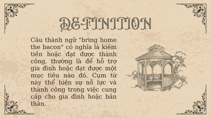 Câu thành ngữ “bring home the bacon” có nghĩa là kiếm tiền hoặc đạt được thành công, thường là để hỗ trợ gia đình hoặc đạt được một mục tiêu nào đó. Cụm từ này thể hiện sự nỗ lực và thành công trong việc cung cấp cho gia đình hoặc bản thân.