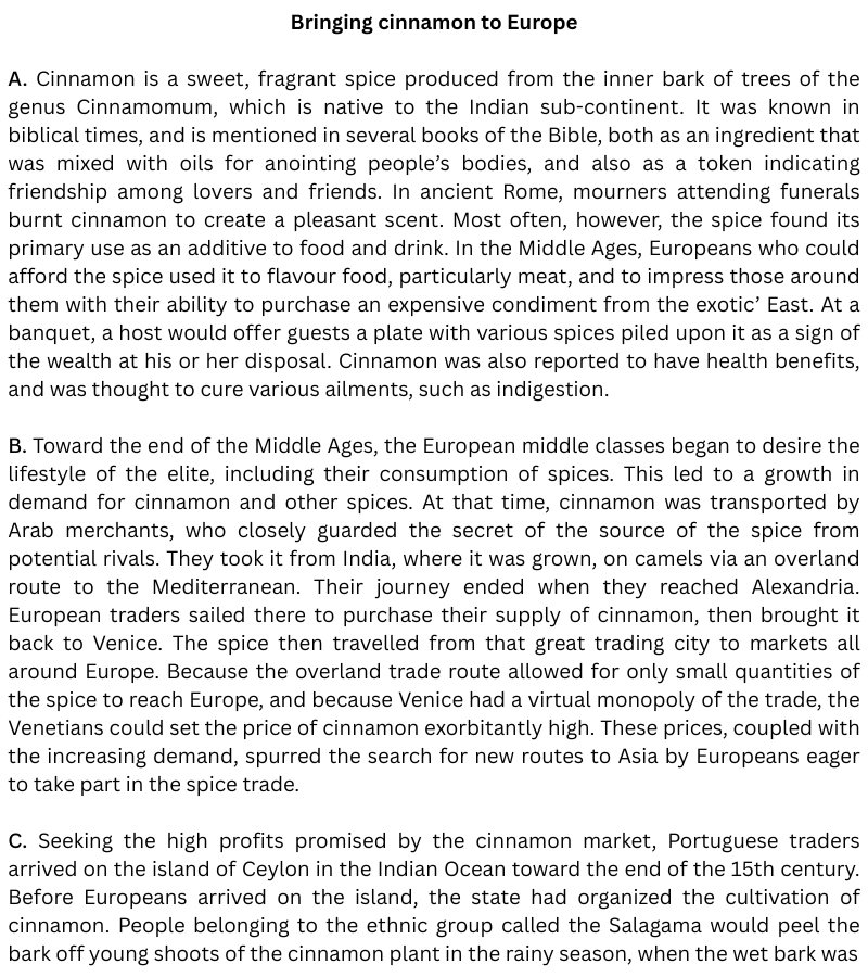 Dưới đây là đề bài bài đọc Bring cinnamon to Europe: