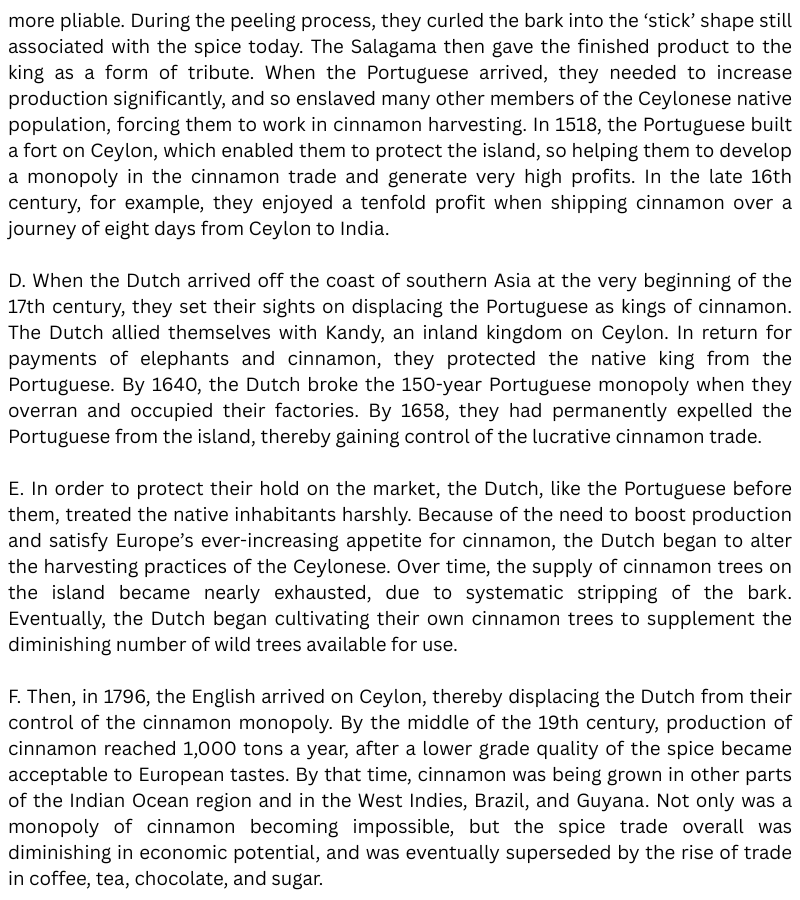 11. The Dutch took over the cinnamon trade from the Portuguese as soon as they arrived in Ceylon. → FALSE
