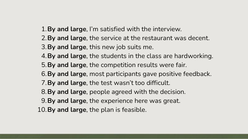 Thành ngữ by and large thường dùng khi bạn muốn đưa ra một đánh giá tổng quát thay vì nói về từng chi tiết riêng lẻ.