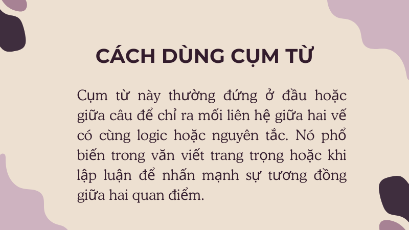 Cụm từ này thường đứng ở đầu hoặc giữa câu để chỉ ra mối liên hệ giữa hai vế có cùng logic hoặc nguyên tắc. Nó phổ biến trong văn viết trang trọng hoặc khi lập luận để nhấn mạnh sự tương đồng giữa hai quan điểm.