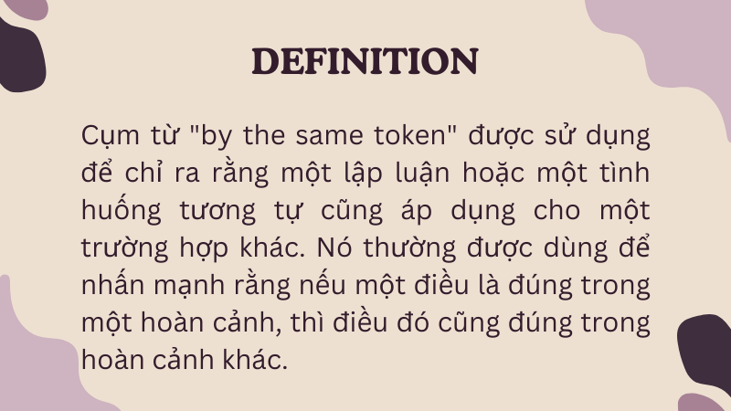 Cụm từ “by the same token” được sử dụng để chỉ ra rằng một lập luận hoặc một tình huống tương tự cũng áp dụng cho một trường hợp khác. Nó thường được dùng để nhấn mạnh rằng nếu một điều là đúng trong một hoàn cảnh, thì điều đó cũng đúng trong hoàn cảnh khác.