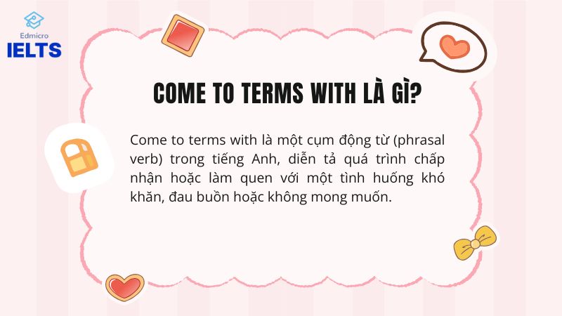 Come to terms with là một cụm động từ (phrasal verb) trong tiếng Anh, diễn tả quá trình chấp nhận hoặc làm quen với một tình huống khó khăn, đau buồn hoặc không mong muốn.