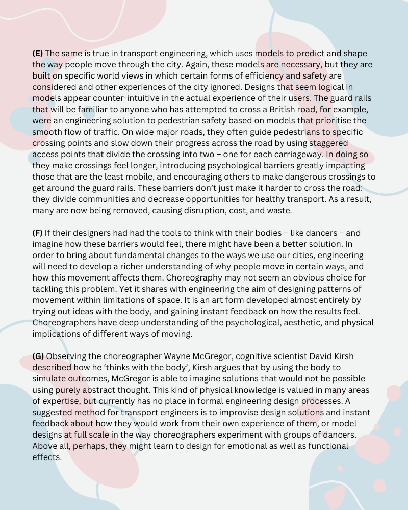 Giải thích: Đoạn văn cho thấy rằng các vũ đạo không phải lúc nào cũng được lựa chọn để giải quyết vấn đề cụ thể, nhưng lại có mục đích tương tự như kỹ thuật, đó là thiết kế các bước di chuyển trong một khoảng cách nhất định. Vì vậy, đáp án là “F”.