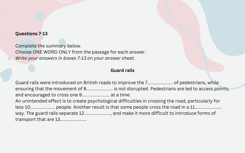 Giải thích: Câu hỏi yêu cầu một danh từ mà “guard rails” đã cải thiện cho người đi bộ. Đoạn văn đề cập rằng “guard rails” thường thấy ở Anh là một biện pháp kỹ thuật nhằm đảm bảo “safety” (an toàn). Do đó, từ cần điền là “safety”.