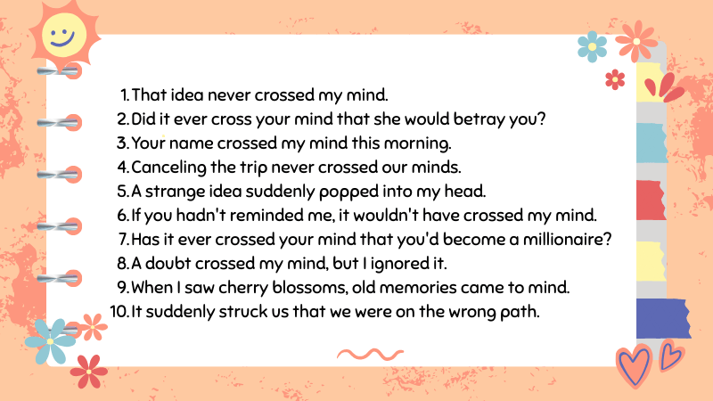| Cross my thoughts | Thoáng qua suy nghĩ (giống cross my mind) | Your name crossed my thoughts yesterday. (Tên bạn đã thoáng qua trong suy nghĩ tôi hôm qua.) |