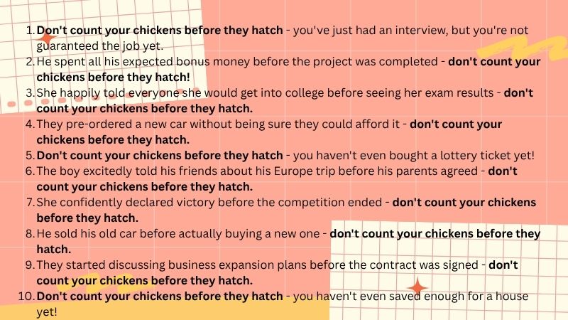 Don’t count your chickens before they hatch trong cuộc hội thoại hàng ngày