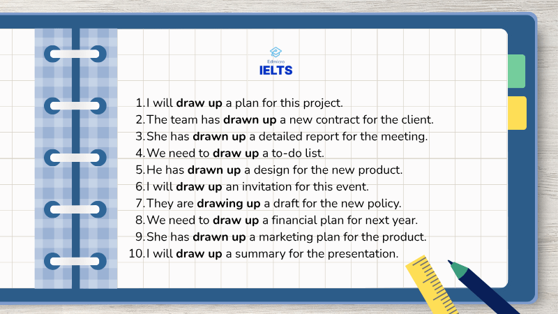 | Soạn thảo, lập, phác thảo (một tài liệu, kế hoạch, danh sách, hợp đồng, v.v.) | – The lawyers are drawing up a contract. (Các luật sư đang soạn thảo một hợp đồng.) – Can you draw up a list of all the tasks that need to be done? (Bạn có thể lập một danh sách tất cả các nhiệm vụ cần thực hiện không?) – We need to draw up a detailed plan for the project. (Chúng ta cần lập một kế hoạch chi tiết cho dự án.) |