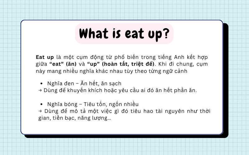 Eat up được kết hợp giữa “eat” (ăn) và “up” (hoàn tất, triệt để). Khi đi chung, cụm này mang nhiều nghĩa khác nhau tùy theo từng ngữ cảnh: