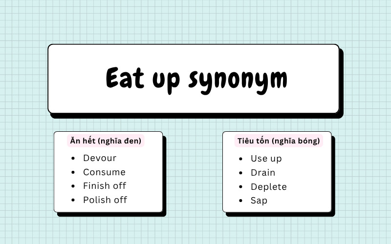 | Ngữ cảnh | Eat up synonym | Nghĩa tiếng Việt | Ví dụ minh họa |