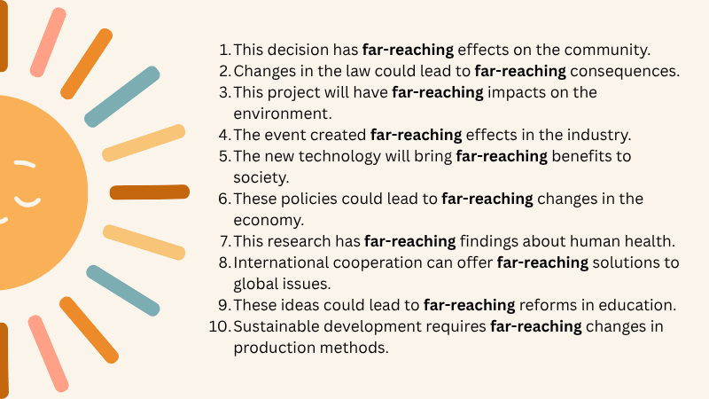 Tóm lại, “far reaching” là một từ hữu ích để mô tả những điều có tác động sâu rộng và quan trọng. Việc sử dụng tính từ này giúp bạn nhấn mạnh tầm ảnh hưởng lớn của một sự kiện, quyết định hoặc thay đổi nào đó.