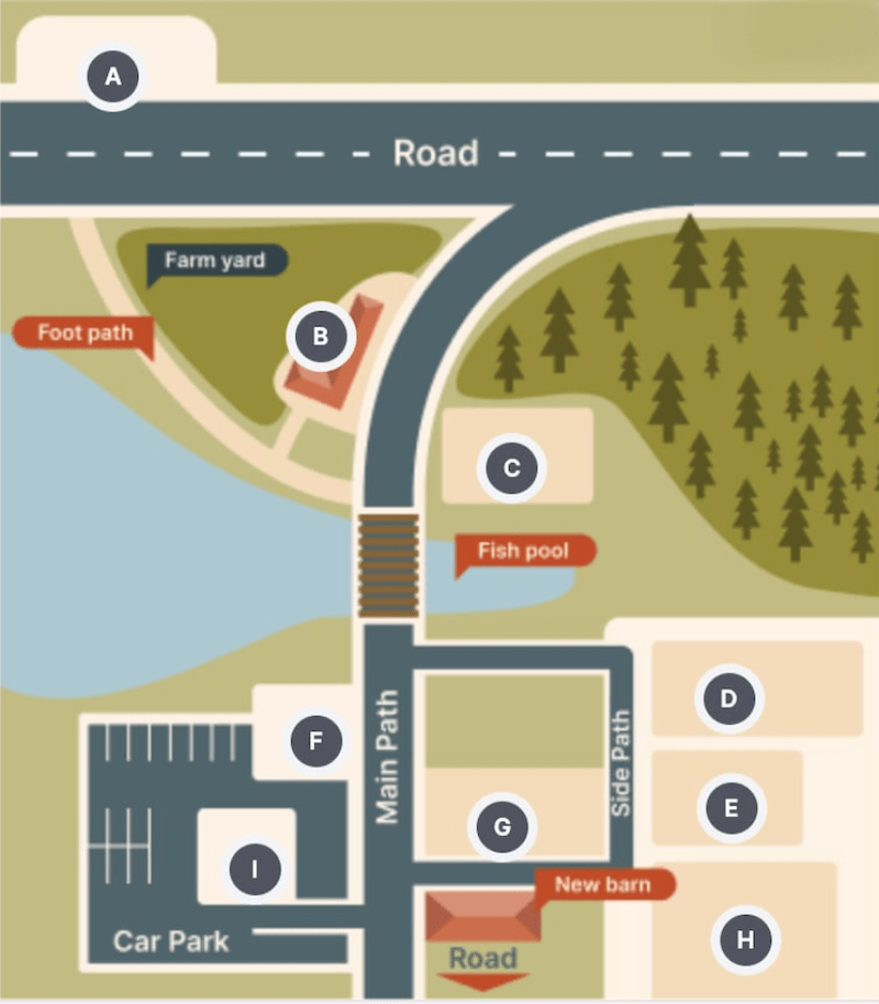 Đoạn nói chứa đáp án: “And the last thing to mention is Fiddy House itself. From here you can cross the bridge then walk along the footpath through the field to the left of the farmyard. That goes to the house, and it’ll”