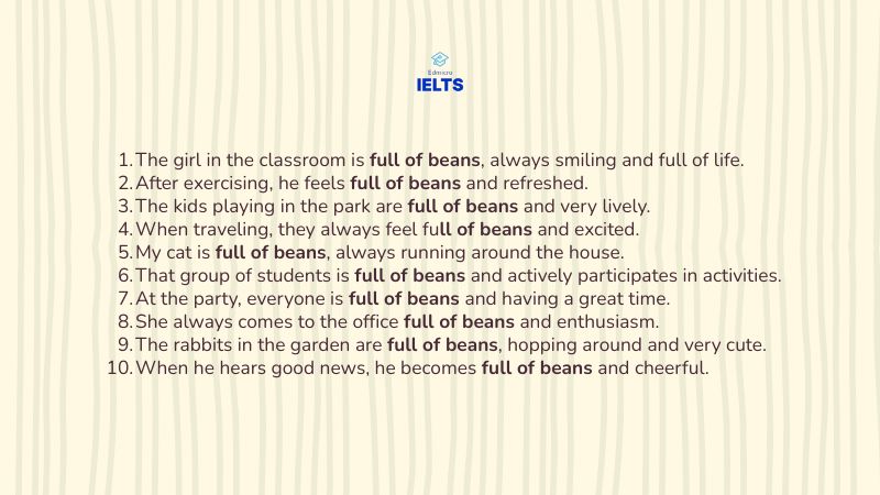 Bài tập: Viết lại chúng sang tiếng Anh bằng cách sử dụng cụm từ “full of beans”.