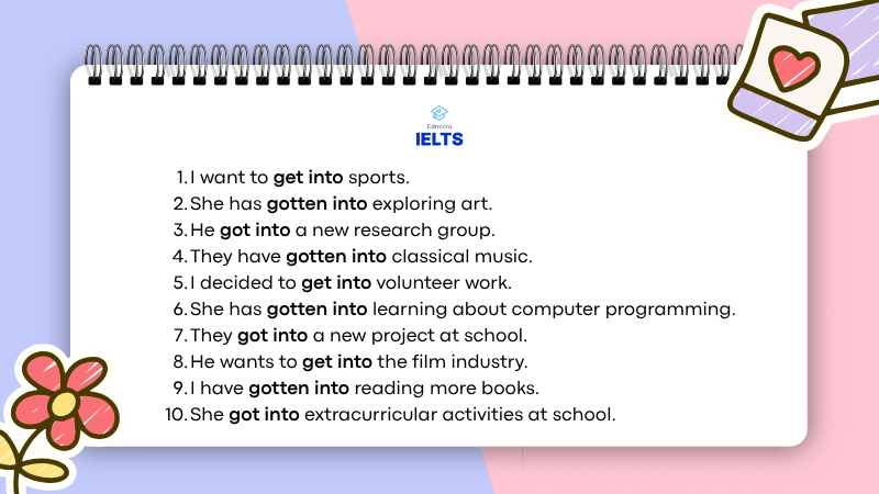 | Bắt đầu quan tâm, yêu thích, hoặc tham gia một hoạt động/sở thích nào đó | – She’s really gotten into yoga lately. (Dạo này cô ấy rất thích tập yoga.) – I’ve been trying to get into reading more books. (Tôi đang cố gắng đọc nhiều sách hơn.) – He got into trouble for cheating on the exam. (Anh ta gặp rắc rối vì gian lận trong kỳ thi.) |