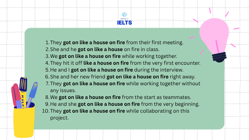 Thành ngữ Get on like a house on fire là một cách diễn đạt tuyệt vời để mô tả mối quan hệ giữa những người nhanh chóng trở nên thân thiết, hòa hợp và có nhiều điểm chung. Việc hiểu và sử dụng thành ngữ này không chỉ làm phong phú vốn từ vựng tiếng Anh của bạn mà còn giúp bạn diễn tả một cách sinh động về những tình bạn hay mối quan hệ nảy nở nhanh chóng và đầy tích cực.