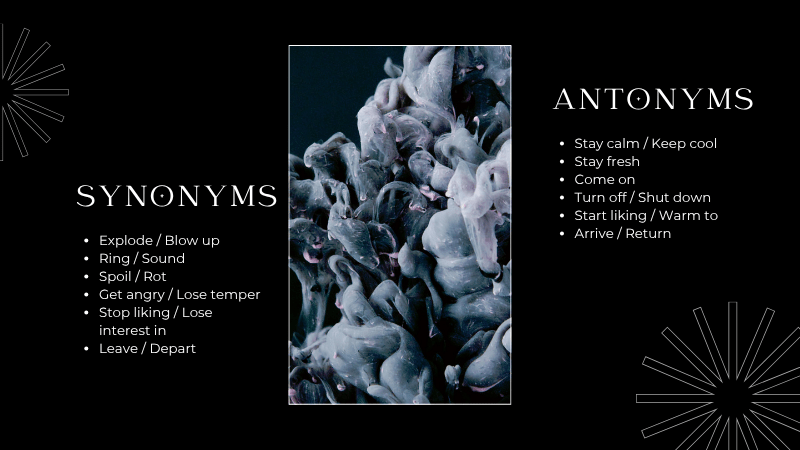 Dưới đây là một số từ mang ý nghĩa tương đồng và trái ngược với go off.