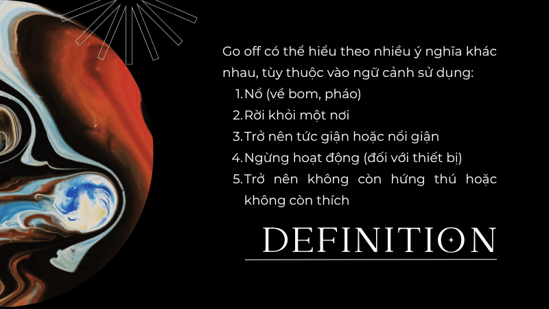 Go off có thể hiểu theo nhiều ý nghĩa khác nhau, tùy thuộc vào ngữ cảnh sử dụng: