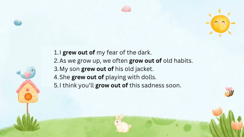 - She grew out of her fear of public speaking. (Cô ấy đã vượt lên nỗi sợ khi phải nói trước công chúng.)