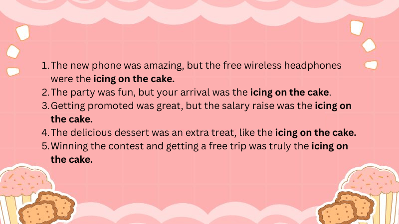 - Getting the promotion was amazing, but the bonus was the icing on the cake. (Được thăng chức đã là một niềm vui lớn, còn khoản thưởng đi kèm mới thực sự là điều ngọt ngào nhất.)