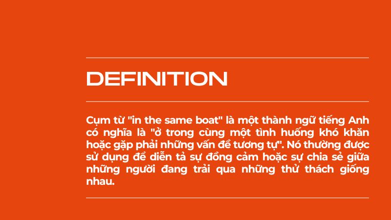 Cụm từ “in the same boat” là một thành ngữ tiếng Anh có nghĩa là “ở trong cùng một tình huống khó khăn hoặc gặp phải những vấn đề tương tự“. Nó thường được sử dụng để diễn tả sự đồng cảm hoặc sự chia sẻ giữa những người đang trải qua những thử thách giống nhau.