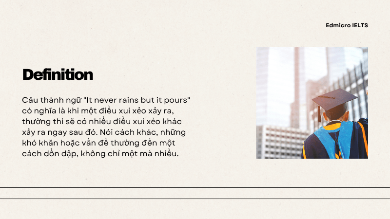 It never rains but it pours là một cụm thành ngữ khá quen thuộc trong các đề thi tiếng Anh. Vậy bạn đã hiểu hết ý nghĩa cụm từ này hay chưa? Hãy cùng Edmicro tìm hiểu rõ hơn về chủ đề này nhé!