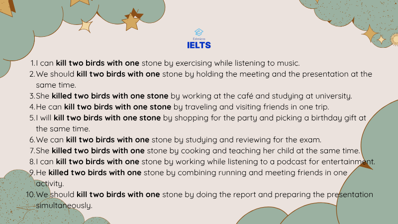 | Do two things in one action | Làm hai việc trong một hành động | I replied to emails while waiting for my coffee – did two things in one action. (Tôi đã trả lời email trong lúc chờ cà phê – làm hai việc trong một hành động.) |