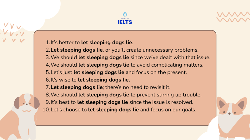 - The argument with my sister happened months ago. I’m just going to let sleeping dogs lie and not bring it up again. (Cuộc tranh cãi với chị gái tôi đã xảy ra cách đây nhiều tháng rồi. Tôi sẽ để yên chuyện đó và không nhắc lại nữa.)