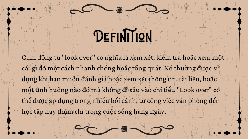 Cụm động từ “look over” có nghĩa là xem xét, kiểm tra hoặc xem một cái gì đó một cách nhanh chóng hoặc tổng quát. Nó thường được sử dụng khi bạn muốn đánh giá hoặc xem xét thông tin, tài liệu, hoặc một tình huống nào đó mà không đi sâu vào chi tiết. “Look over” có thể được áp dụng trong nhiều bối cảnh, từ công việc văn phòng đến học tập hay thậm chí trong cuộc sống hàng ngày.