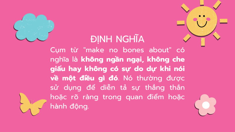 Cụm từ “make no bones about” có nghĩa là không ngần ngại, không che giấu hay không có sự do dự khi nói về một điều gì đó. Nó thường được sử dụng để diễn tả sự thẳng thắn hoặc rõ ràng trong quan điểm hoặc hành động.