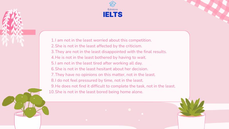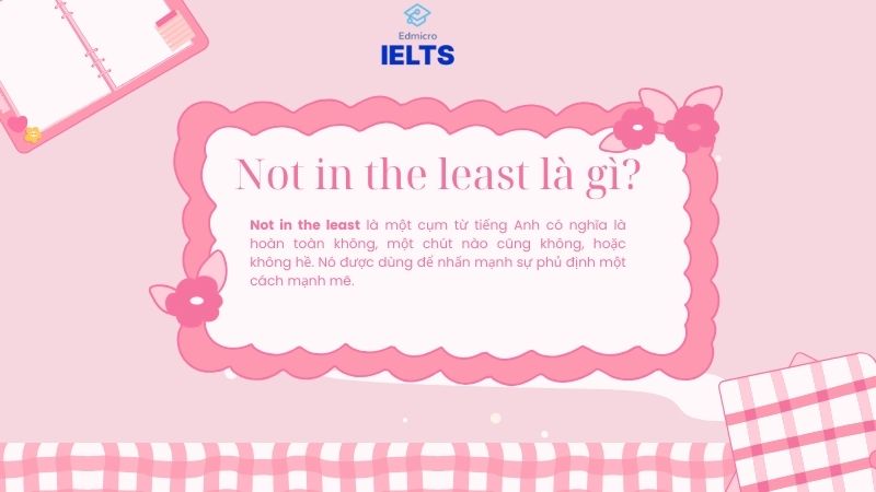 Not in the least là một cụm từ tiếng Anh có nghĩa là hoàn toàn không, một chút nào cũng không, hoặc không hề. Nó được dùng để nhấn mạnh sự phủ định một cách mạnh mẽ.