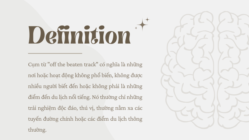 Cụm từ “off the beaten track” có nghĩa là những nơi hoặc hoạt động không phổ biến, không được nhiều người biết đến hoặc không phải là những điểm đến du lịch nổi tiếng. Nó thường chỉ những trải nghiệm độc đáo, thú vị, thường nằm xa các tuyến đường chính hoặc các điểm du lịch thông thường.