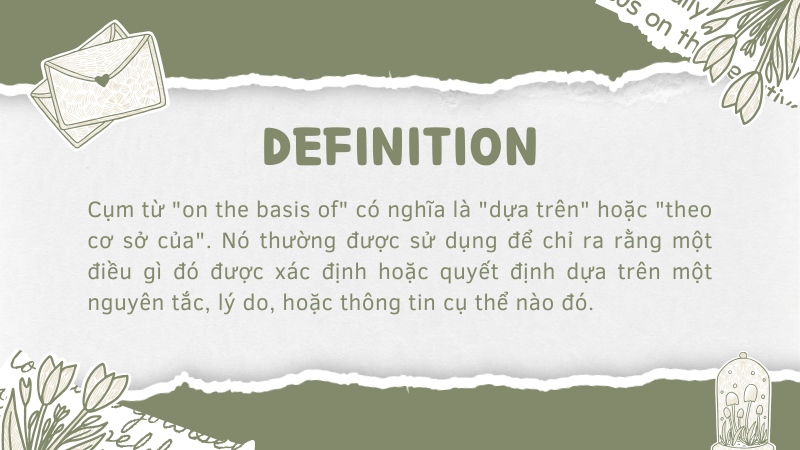 Cụm từ “on the basis of” có nghĩa là “dựa trên” hoặc “theo cơ sở của”. Nó thường được sử dụng để chỉ ra rằng một điều gì đó được xác định hoặc quyết định dựa trên một nguyên tắc, lý do, hoặc thông tin cụ thể nào đó.