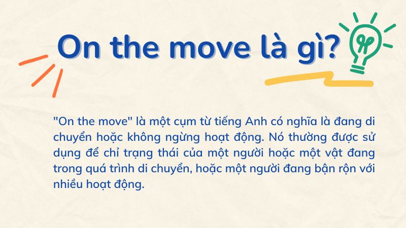 “On the move” là một cụm từ tiếng Anh có nghĩa là đang di chuyển hoặc không ngừng hoạt động. Nó thường được sử dụng để chỉ trạng thái của một người hoặc một vật đang trong quá trình di chuyển, hoặc một người đang bận rộn với nhiều hoạt động.
