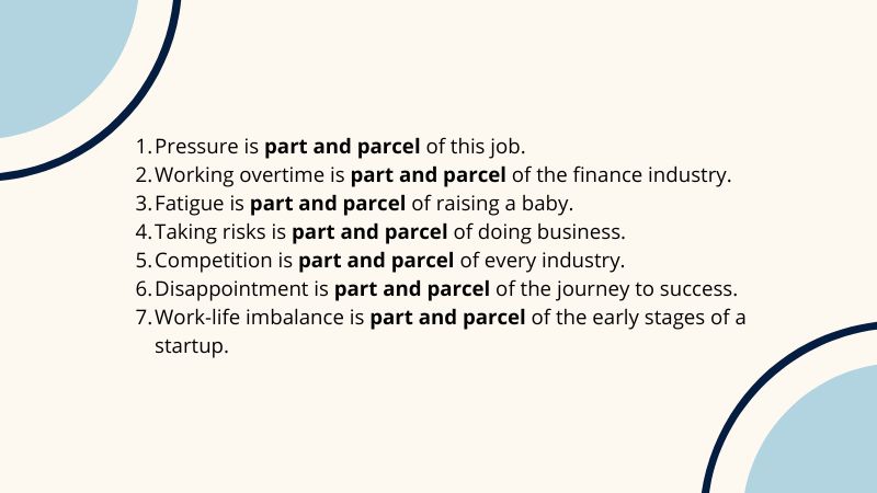 Part and parcel of something là một idiom dùng để diễn đạt một phần thiết yếu, không thể tách rời của cái gì đó, thường là những điều không dễ chịu nhưng là điều tất yếu trong một tình huống, nghề nghiệp hoặc cuộc sống.
