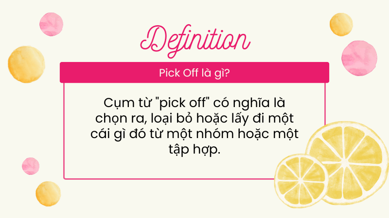 Cụm từ pick off trong tiếng Anh là một phrasal verb có nhiều nghĩa tùy theo ngữ cảnh. Dưới đây là các nghĩa phổ biến nhất của “pick off”: