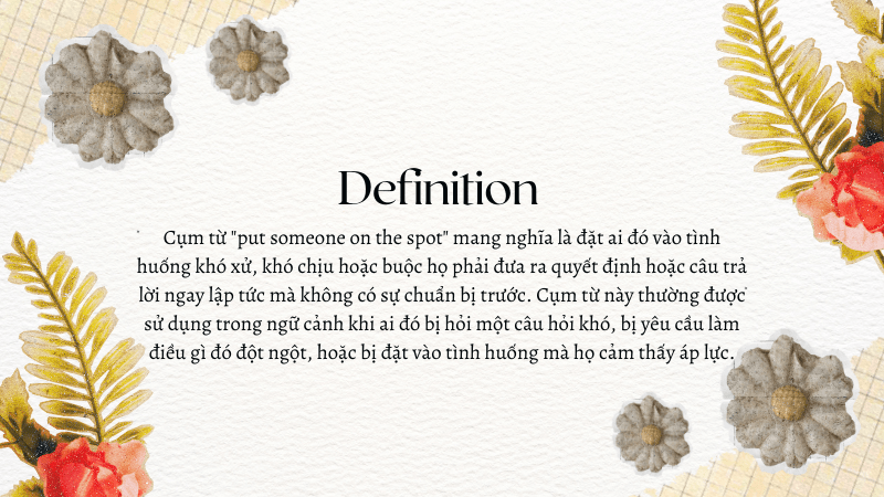 Cụm từ “put someone on the spot” mang nghĩa là đặt ai đó vào tình huống khó xử, khó chịu hoặc buộc họ phải đưa ra quyết định hoặc câu trả lời ngay lập tức mà không có sự chuẩn bị trước. Cụm từ này thường được sử dụng trong ngữ cảnh khi ai đó bị hỏi một câu hỏi khó, bị yêu cầu làm điều gì đó đột ngột, hoặc bị đặt vào tình huống mà họ cảm thấy áp lực.