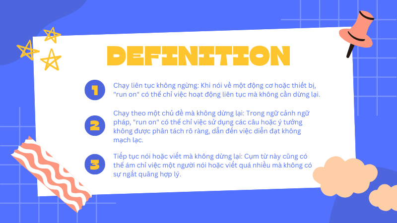 - Chạy theo một chủ đề mà không dừng lại: Trong ngữ cảnh ngữ pháp, “run on” có thể chỉ việc sử dụng các câu hoặc ý tưởng không được phân tách rõ ràng, dẫn đến việc diễn đạt không mạch lạc.