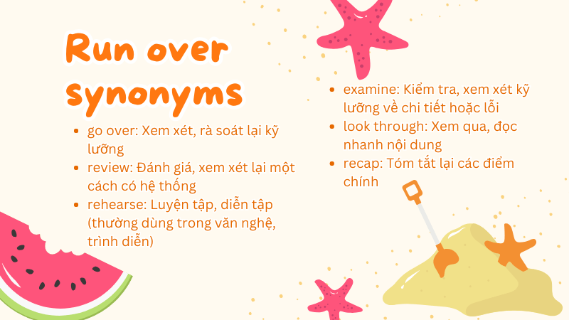 | 2. Xem lại, rà soát nhanh | Dùng khi muốn ôn lại, luyện tập hoặc kiểm tra nhanh một nội dung. | Let’s run over the main ideas before the test. (Hãy xem lại những ý chính trước bài kiểm tra.) |