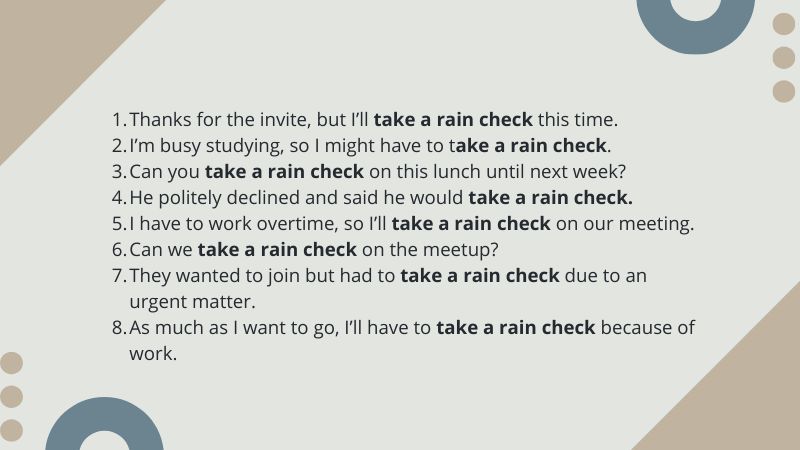 Dưới đây là các cuộc hội thoại ví dụ về take a rain check, giúp các bạn học hiểu rõ hơn về ý nghĩa thành ngữ này.