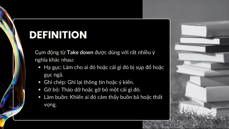 Cụm động từ Take down được dùng với rất nhiều ý nghĩa khác nhau: